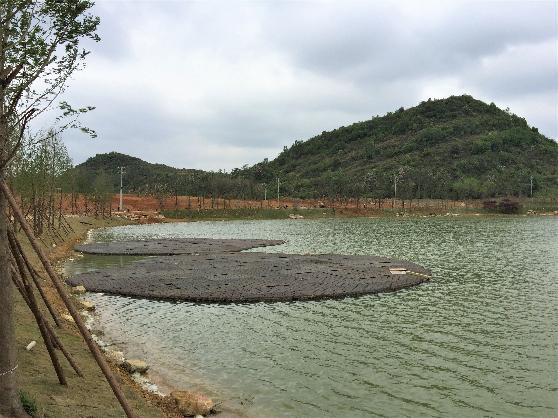 貴安新區(qū)兩湖一河項目浮動濕地分布于北二區(qū)和星月湖二期C區(qū),首件浮動濕地位于月亮湖公園二期北二區(qū),由上下兩部分組成,上部結(jié)構(gòu)采用復(fù)合纖維材料具有載體材質(zhì)的高效能填充物組裝而成,浮動濕地載體上面布置植物種植孔,孔徑9cm;孔深10cm;相鄰孔中心間距19cm,空隙中栽種水生植物,可以使空隙中的水生植物穿透浮動濕地直達到水體,并在載體內(nèi)部橫向及縱向植根。浮動濕地是項目一個重要的施工環(huán)節(jié),屬于新型環(huán)保設(shè)施,零排放、零污染、零消耗,利用水生植物自然凈化水質(zhì)。